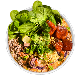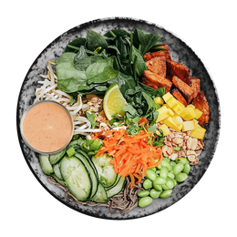 Soba noodles ( fideos de trigo sarraceno) espinaca baby, edamame, pepino, zanahoria thai, brotes de soja, mango y thai mix ( mix de cacahuetes, anacardos, cebolla crispy y sésamo. Salsa: Peanut thai