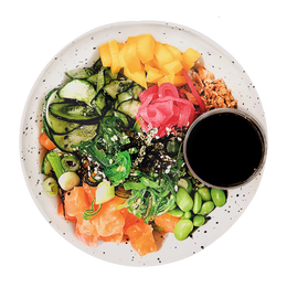 Arroz de sushi, spicy salmón, pepino, edamame, wakame (seaweed salad) mango, pickle de cebolla morada con gengibre, cebolla crispy, nori mix (mix de sésamo, alga nori y togarashi ) Salsa: Yuzu ponzu ( soja con un toque cítrico japonés)