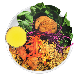 Quinoa bio, espinaca baby, boniato asado, garbanzos rosti, zanahoria al sésamo, pickle de col lombarda, anacardos tostados al curry con uvas pasas sultanas. Salsa: Curry Tahini (VEGAN)