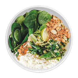 Arroz basmati, aromático curry verde con leche de coco, champiñones, judías, bamboo, brócoli, limonaria y galanga, brotes de soja, espinaca baby, thai mix (crunchy de cacahuetes, anacardos, cebolla frita y sésamo)