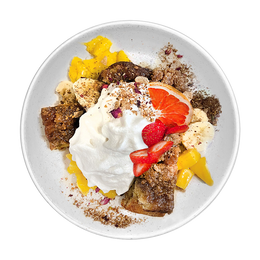 Deliciosas tostadas francesas hechas al horno con un crujiente crumble, acompañada de fruta, sirope de arce bio, espuma de coco y pandan y nuestro sweet dukkah ( mezcla de muchos frutos secos horneados con especies, canela y rosas )
