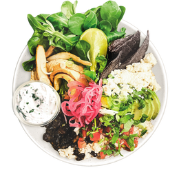 Arroz integral, cánonigos, frijoles negros, pico de gallo, aguacate, pickle de cebolla morada, feta, chips de tortilla artesanales. Salsa: Cilantro sour cream