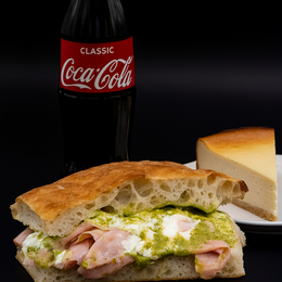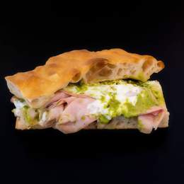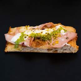 Mozzarrella, parmesano, mortadella, burrata, pistacchio, aceite de albahaca y pesto