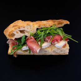 jamón serrano, rúcula, tómate en rodajas y mozzarella