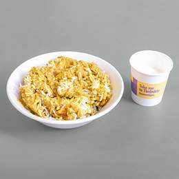 Arroz basmati con nuestro curry de pollo con leche de coco y un toque de picante. Servido con un vasito de yogur para acompañarlo.