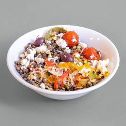Deliciosa ensalada de lentejas, con pimiento rojo, verde y amarillo, tomate natural y una salsa de limon, miel y mostaza!