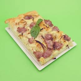 Focaccia de Buenas Migas (una receta de toda la vida) con cebolla, butifarra y pimienta negra.