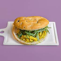 Focaccina de Buenas Migas rellena con nuestro pollo al curry con su salsa de Filippo de Cornwall (lleva mayonesa, pasas, cúrcuma, canela, curry y chutney de mango),