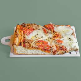 Una base de focaccia clásica con atún, tomate, pimiento y queso, deliciosa!