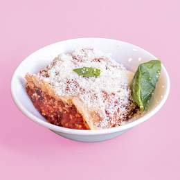 Nuestra lasaña de Buenas Migas con la salsa ragú cocida lentamente entre capas de lasaña, bechamel y con mucho queso parmesano.