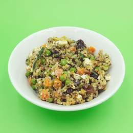 Quinoa con queso feta, guisantes, zanahoria, arándanos, pasas, pipas de calabaza, menta fresca y una salsa de miel, jengibre y limón.
