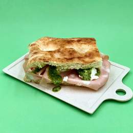 Nuestro pan de focaccia con mortadella italiana, pesto y queso crescenza