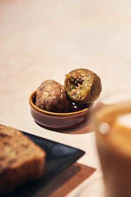 Un menú saludable y 100% vegetariano (con opción vegana). Incluye sopa vegana del día, una tostada de cara abierta, ensalada de col, pesto vegano, el zumo del día y una bolita energética vegana sin azúcar. *La ensalada de col lleva mayonesa.*