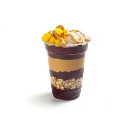 Deliciosa base de Açaí acompañado con Granola, Coco Rallado, Crema de Cacahuete y refrescante topping de Mango.