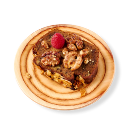 Banana bread con canela, vainilla, almendras, nueces caramelizadas y frambuesa.