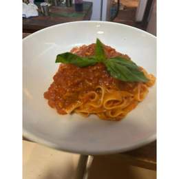 Tagliatella en salsa de tomate San Marzano con refrito de zanahoria, cebolla, apio, albahaca y carne picada Beyond