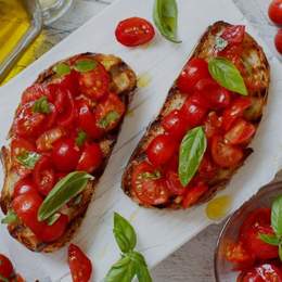 Tomate, mozzarella Violife, olivas negras, alcaparras y orégano