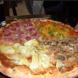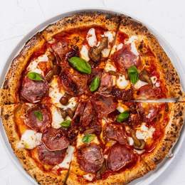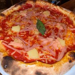 Mitad margherita y mitad rellena a calzone con verduras de temporada y jamón york violife