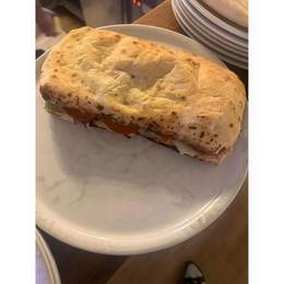 Bocadillo de pan de pizza con calabacines a la parrilla con ajo y evo, ensalada romana, cebolla rebanada, zanahoria rayada, mayonesa vegana y chorizo heura