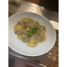 Raviolis hechos a mano relleno de ceps en salsa de margarina y hierba buena