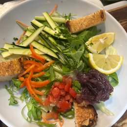 Ensalada ,tomate, cebolla caramelizada , pimiento rojo, zanahoria , limones, calabacín y pan tostado