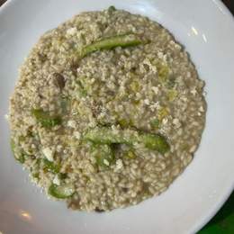 Risotto mantecato con mantequilla vegana, ceps y espárragos frescos