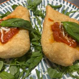 Pizzita frita de masa con tomate albahaca y mozzarella vio life