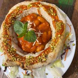 Gnocchi frescos en salsa de tomate sorrentina servido en cuenco de pan con el borde relleno de mozzarella Violifeviolife