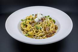 Espaguetis con guanciale, huevo, queso pecorino, pimienta negra y perlas de trufa negra