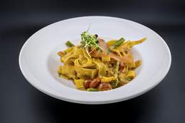 Tallarines anchos con salsa rosa, salmón ahumado, puerro y espárragos verdes