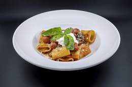 Paccheri con salsa de tomate, guanciale, cebolla, guindilla, stracciatella, albahaca y menta