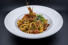 Tallarines con gambas, ajo, tomate cherry,vino blanco, ralladura de lima y pesto