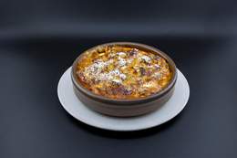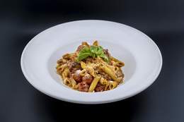Macarrones con salsa de tomate cherry, berenjena, albahaca, queso pecorino y mozzarella de búfala