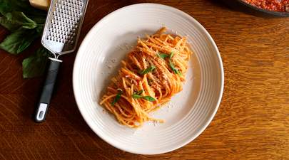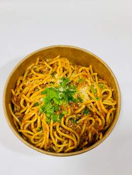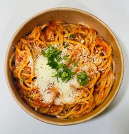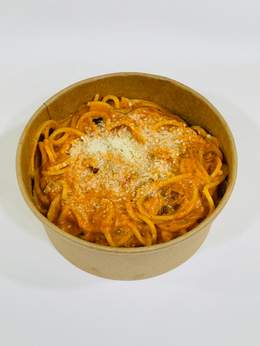 Sofrito de cebolla, zanahoria y apio. Carne picada de proximidad (100% ternera y esfumada con vino tinto cocinada a fuego lento con tomates pelati italianos y pimienta negra recién molida.