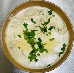 Ravioli de carne, salsa de la casa y gorgonzola con crema de leche