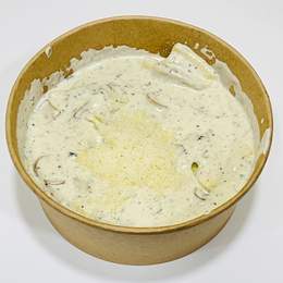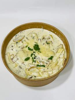 Crema de champiñón, jamón ahumado, nata y Parmesano