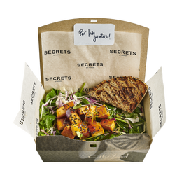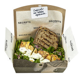 Tofu a la plancha con salsa de soja y sweet chilli. Acompañado de rúcula, espinaca baby, col lombarda, vinagreta cítrica, pipas de girasol y pan de masa madre de 7 cereales.