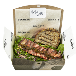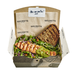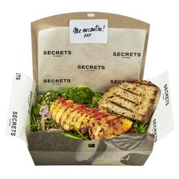 Pechuga de pollo marinada con adobo secreto de especias asiáticas a la brasa y salsa sweet chili. Acompañado de pan y una base de rúcula, espinaca baby y col lombarda con vinagreta cítrica y pipas de girasol.