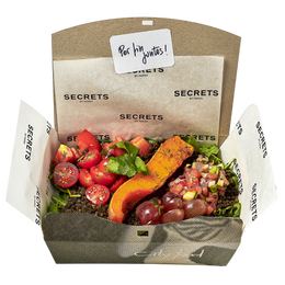 lentejas caviar, calabaza asada, tomatitos, cilantro, nueces, pico de gallo, zaatar, vinagreta de curry rojo y veganesa. Acompañado de una base verde de espinaca con vinagreta cítrica y pipas de girasol.