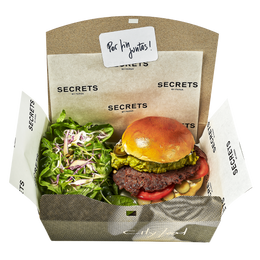 Hamburguesa vegana, salsa veganesa, pepinillo, tomate, guacamole y jalapeños y pan brioche vegano. Acompañado de rúcula, espinaca baby y pipas de girasol.