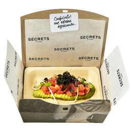 Tartar de aguacate, red quinoa, lentejas, tomatitos, cebolla marinada, arándanos secos, uvas rojas, col lombarda, tahin y vinagreta de Módena. Acompañado de rúcula, espinaca baby y pipas de girasol.