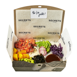con salmón marinado, haba edamame, aguacate, rabanitos, mango, col lombarda, y alga wakame.