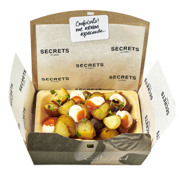 mini patatas con all i oli picante, salsa brava y aceite de harissa