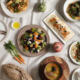 espinacas, piñones, setas, calabaza masala, ricotta, salsa de tomates frescos y secos