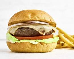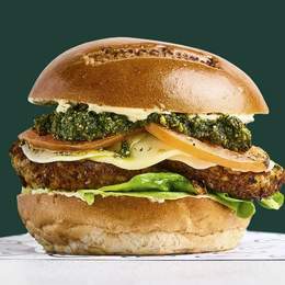 Doble patty vegetal (alubias, maíz, tomate y pimiento rojo), mozzarella vegana, tomate a la parrilla, pesto vegano, lechuga francesa y veganesa, en tierno pan Air.