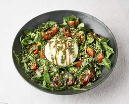 Bowl con burrata, pistacho molido, tomates cherry, rúcula, canónigos, crema de Módena y aceite de albahaca.