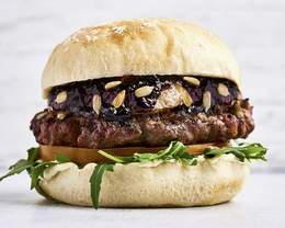 Vacuno Wagyu, queso manchego, cebolla caramelizada casera, rúcula, tomate y mayonesa Timesburg, en tierno pan brioche Soft Air. Top ventas.