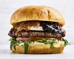 Vacuno, queso de Cabra, cebolla caramelizada casera, confitura de arándanos, tomate, rúcula y mayonesa Timesburg, en tierno pan brioche Soft Air.