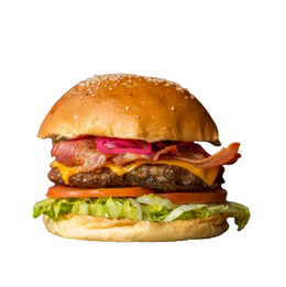 Carne 100% vacuno, queso cheddar, loncha de panceta, pepinillo, salsa barbacoa, tomate y lechuga
