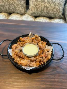 Pollo crujiente, queso cheddar, cebolla caramelizada, salsa de mango y lechuga